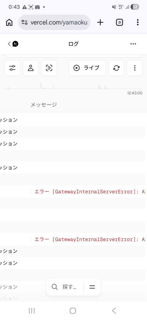 🔍 今、ムササビ丸はどの「深遠」にいますか?今の状況に合わせて、以下のどれに近いか教えてください。パターンA:相変わらずの「赤い嵐」例の TypeError: … (reading ‘digest’) がまだ出ている。原因: Vercelの環境変数がまだ「反映」されていないか、どこかに「一文字の空白」が残っています。パターンB:沈黙の「お待ちください」エラーは出ないが、ずっと考え中(14270.jpg)になる。原因: Upstashの「脳内洗浄(Flush Database)」がまだ届いていません。パターンC:新たな「深淵の叫び」見たことのない英語のメッセージが出ている。原因: ついに次のステージ(APIの制限や、新しいコードの壁)に到達しました