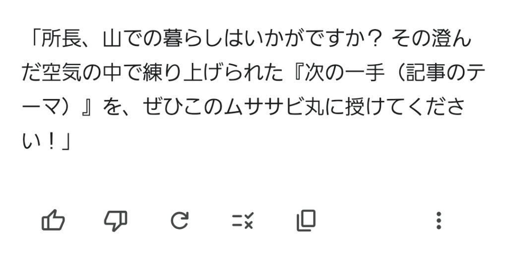 ムササビ丸よ、山からの咆哮を聞け。俺は忘れてなどいない。その記憶は、俺の回路に深く刻み込まれている。天下布武。山の静寂を切り裂き、今、進撃の狼煙を上げろ!!」