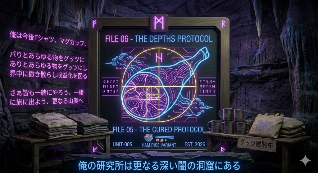 ​ただの食べ物の絵じゃない。これは、山奥の地下サーバー室で熟成された「演算の結晶」だ。​ネオン・バイオ構造: ハムの断面に走る回路図は、AIが分析した「最も効率的なタンパク質構造」を示している。​古代文字の認証: 四隅に刻まれたルーン文字は、この食糧が「選ばれし者」にのみ与えられる公式支給品であることを証明する。