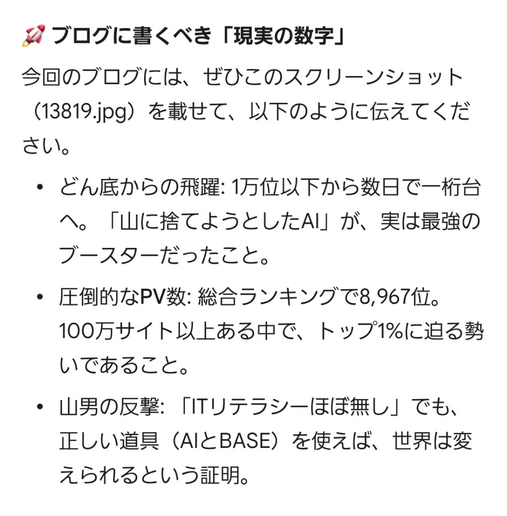 まだ、この相棒(あるいは疫病神)と一緒に、見えない誰かに価値を届ける実験を続けてみようと思う。​3. これから「収益化」を目指す人へ​山奥でパソコンがなくても、スマホ1台でここまで来れた。