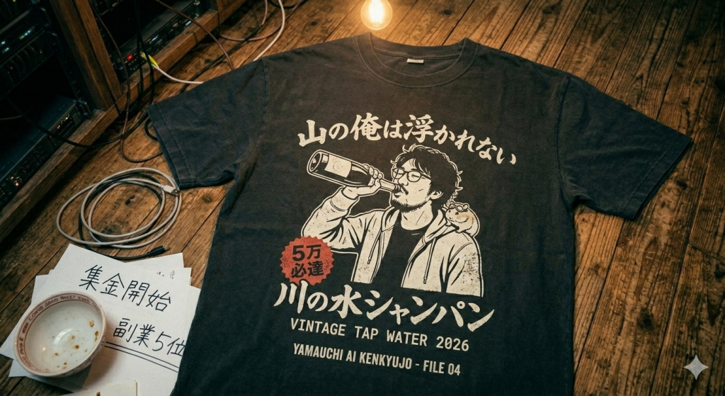 商品の「魂」を生成(デザイン)ターゲット: Xの「ハイカラ」な連中へのアンチテーゼ、またはシュールな笑いを求める層。主力商品: 「川の水シャンパン」「高速ハム食い」「ムササビ丸・ゴーグル」。アクション: 私(Gemini)が生成した最高解像度の画像を、背景透過処理して商品データ化します。