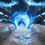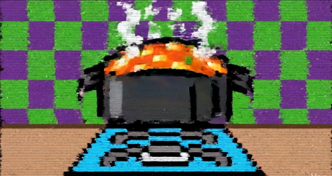 ルーが水面に触れた瞬間、空間にデジタルノイズの波紋(グリッチ)が走り、鍋の中の解像度が強制的に「8ビット(ドット絵)」まで低下します。